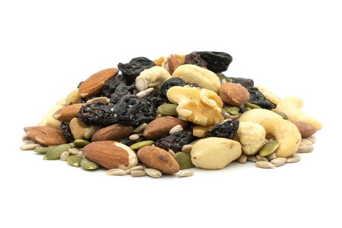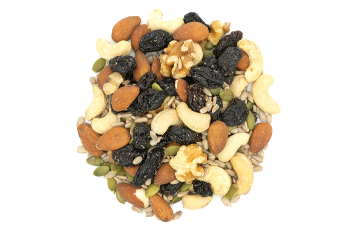 Raw Almonds, Raw Cashews, Black Raisins, Raw Walnuts, Raw Pepitas, & Raw Sunflower Seeds