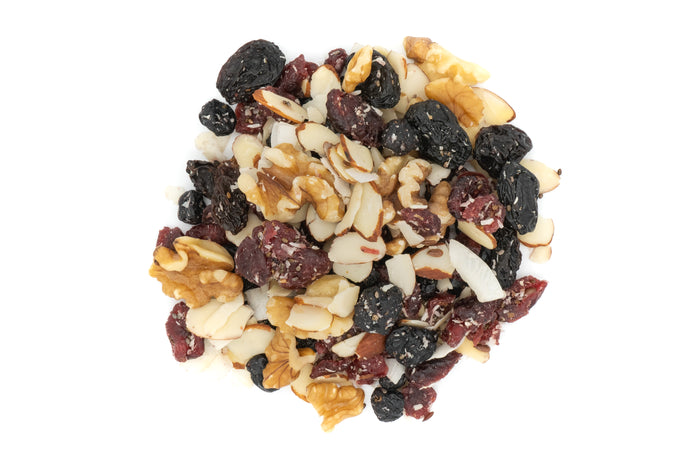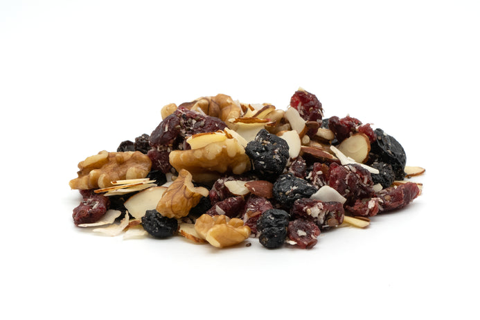 Blueberries, Cranberries, Coconut Flakes, Raisins, Sliced Almonds, Walnuts, Chia Seeds, Brown Flax Seeds, Coconut Chips